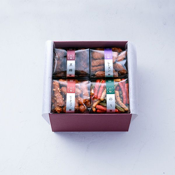 上品な化粧箱に手提げ袋をお付けした、「山脇」の代表的な「黒糖・ピーナッツ・彩り・レーズン・メープル・抹茶・くろ・白蜜」の8品が詰まった逸品です。
