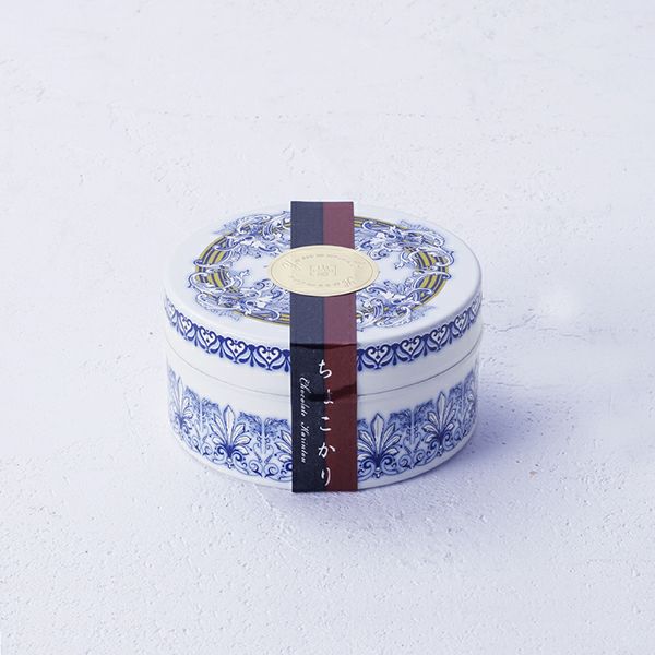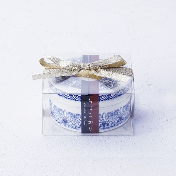 手のひらサイズの陶器のような缶は、プチギフトにもぴったりです。